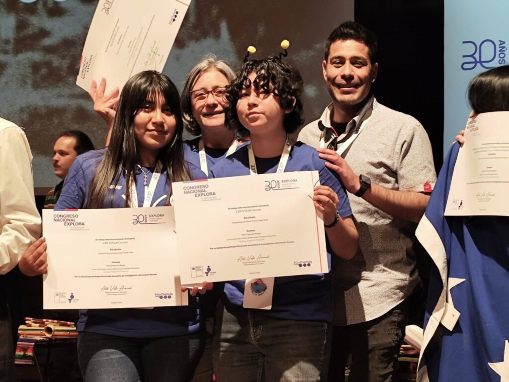 Las estudiantes Conie Crispin y Abigail Alcarraz, junto a su profesora Rosa Checura del Liceo Bernardo O’Higgins expusieron el proyecto LBO STEAM Circular, que considera una muestra itinerante e interactiva sobre gestión de residuos, para sensibilizar y educar ambientalmente a la comunidad.